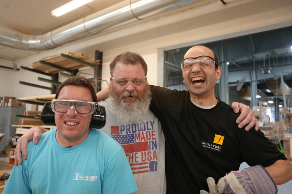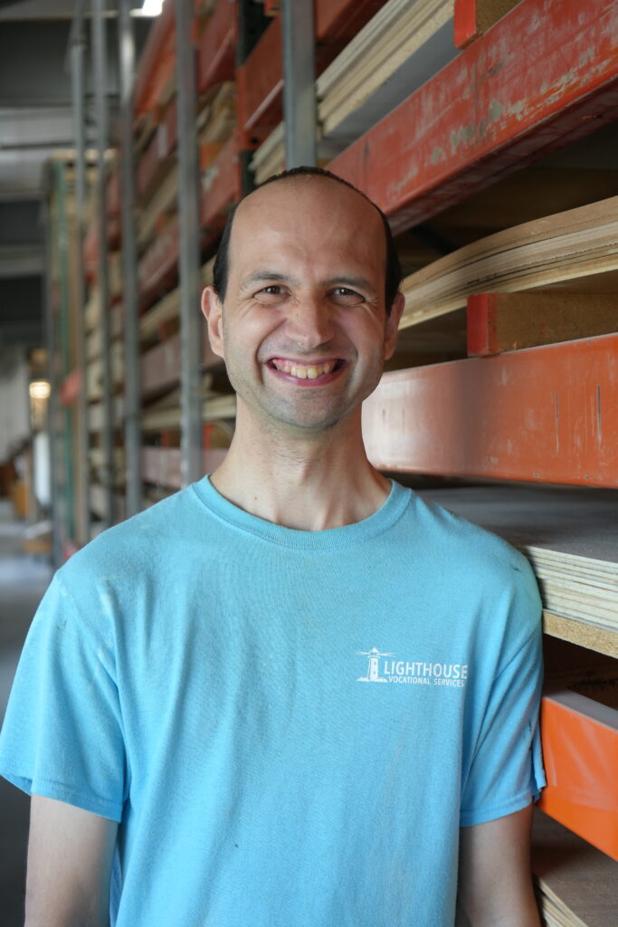 Through Lighthouse’s Small Group Employment Program, Jimmy works at Signature Custom Cabinetry. While the crafts people sand, drill and paint quality cabinetry, Jimmy keeps the warehouse clean.