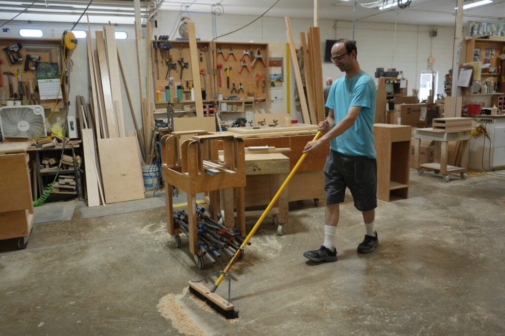 Every weekday morning, Jimmy gathers wood scraps and recycles them, sweeps the sawdust, and takes out the trash. Jimmy comes in every day and has been working in the janitorial service for five years.