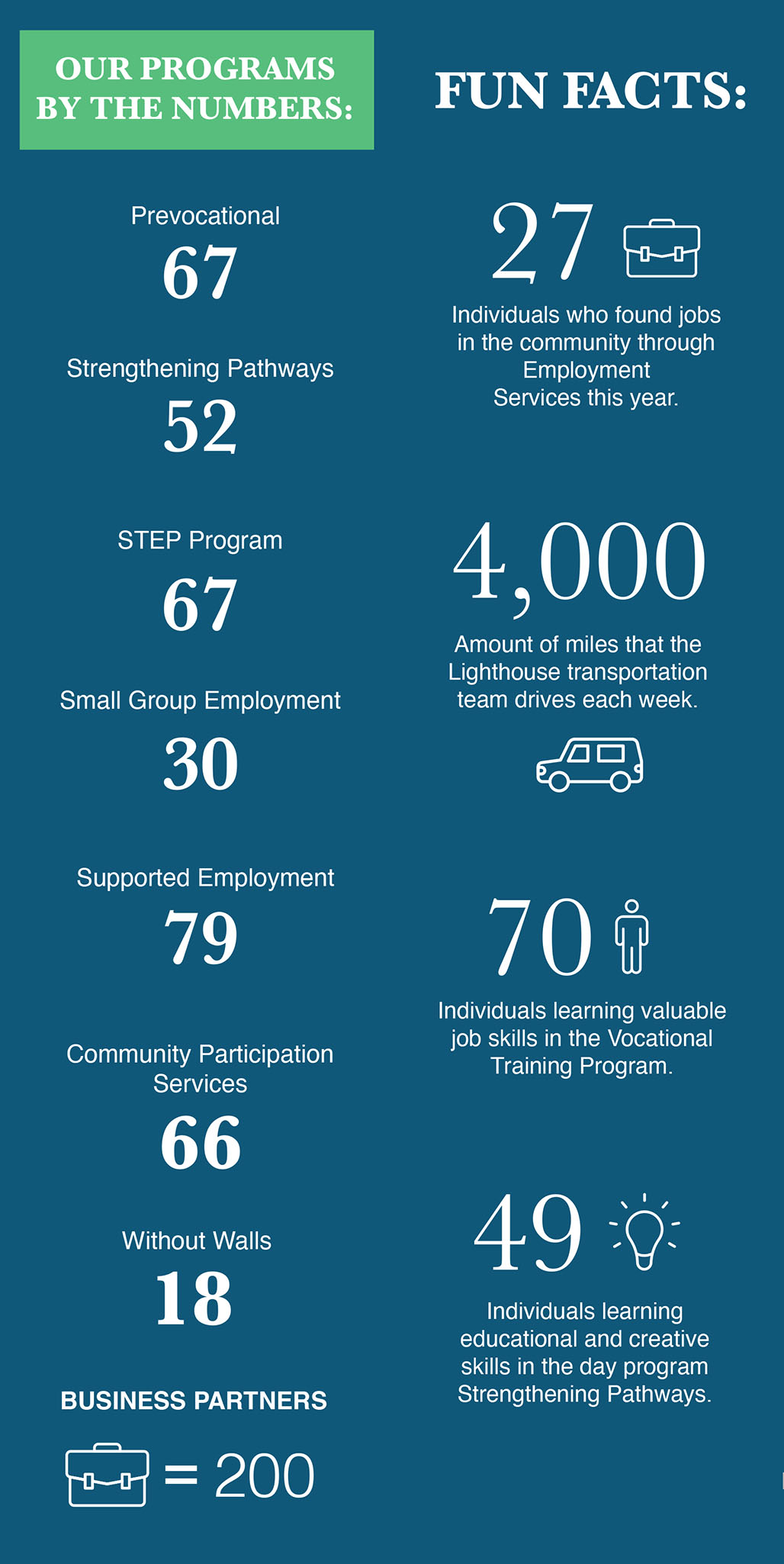 Today, we uniquely serve over 200 individuals in our 25,000 square foot facility in New Holland, PA and in some surrounding counties. Lighthouse offers a variety of in-house, community-based, and online opportunities, helping participants gain skills, explore interests, and prepare for lasting employment. As Lighthouse enters our 50th year in 2025 we look to continue to Shine the Light of Hope & Opportunity to all who walk through our doors!